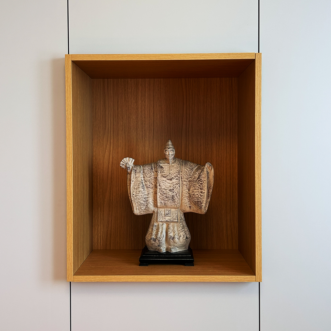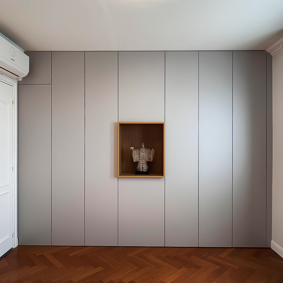 tandis que la niche centrale en chêne naturel crée un point focal chaleureux, idéal pour mettre en valeur un objet d’art.