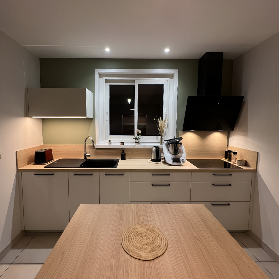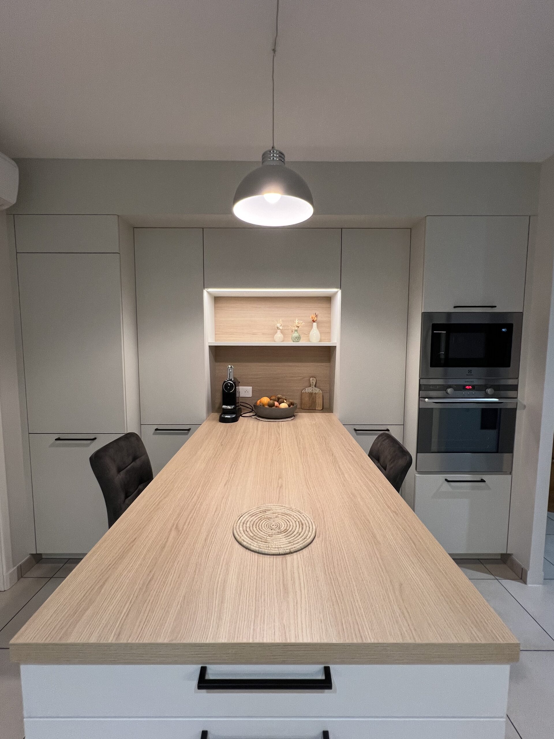 Cette cuisine contemporaine se distingue par son élégance épurée et sa palette de tons naturels. Le plan de travail en bois clair s’harmonise parfaitement avec les façades de meubles crème aux poignées noires sobres, créant un contraste subtil et moderne. L’îlot central en bois renforce l’aspect chaleureux de l’espace tout en offrant une belle surface de préparation ou de repas.
