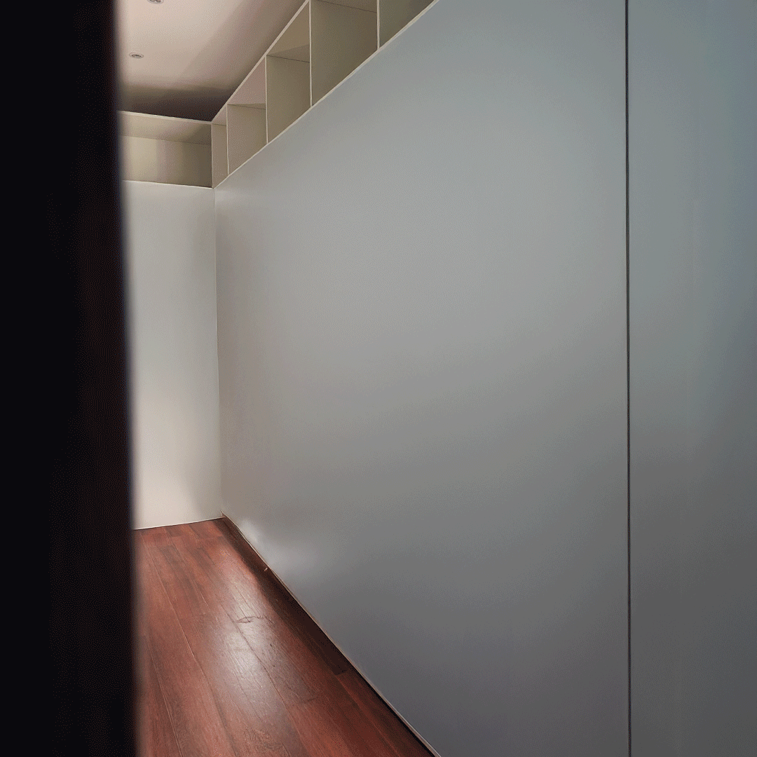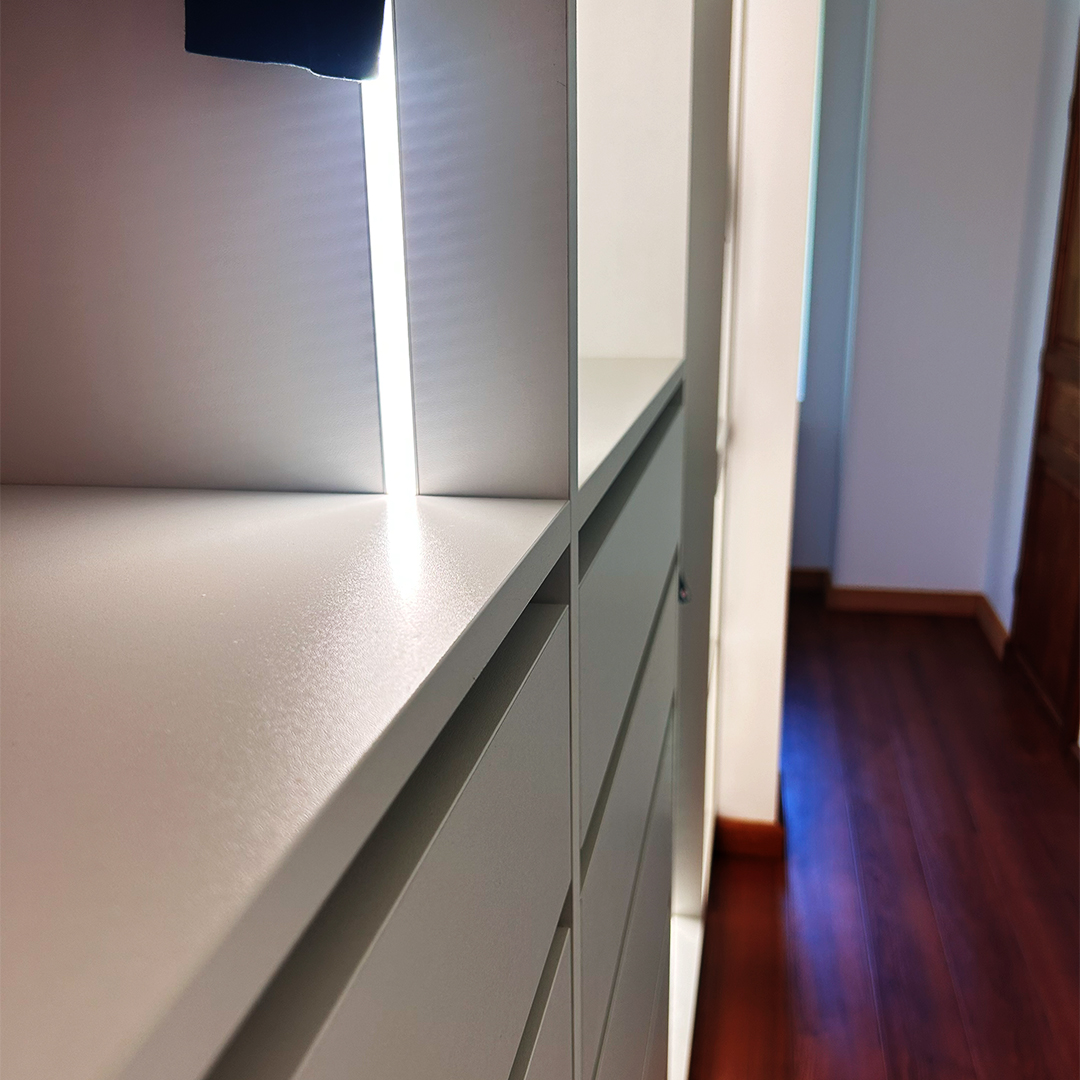Ce dressing sur-mesure allie design épuré et ingéniosité : un espace long et fluide, baigné d’une lumière douce à détection de mouvement, qui s’allume comme par magie à votre passage.