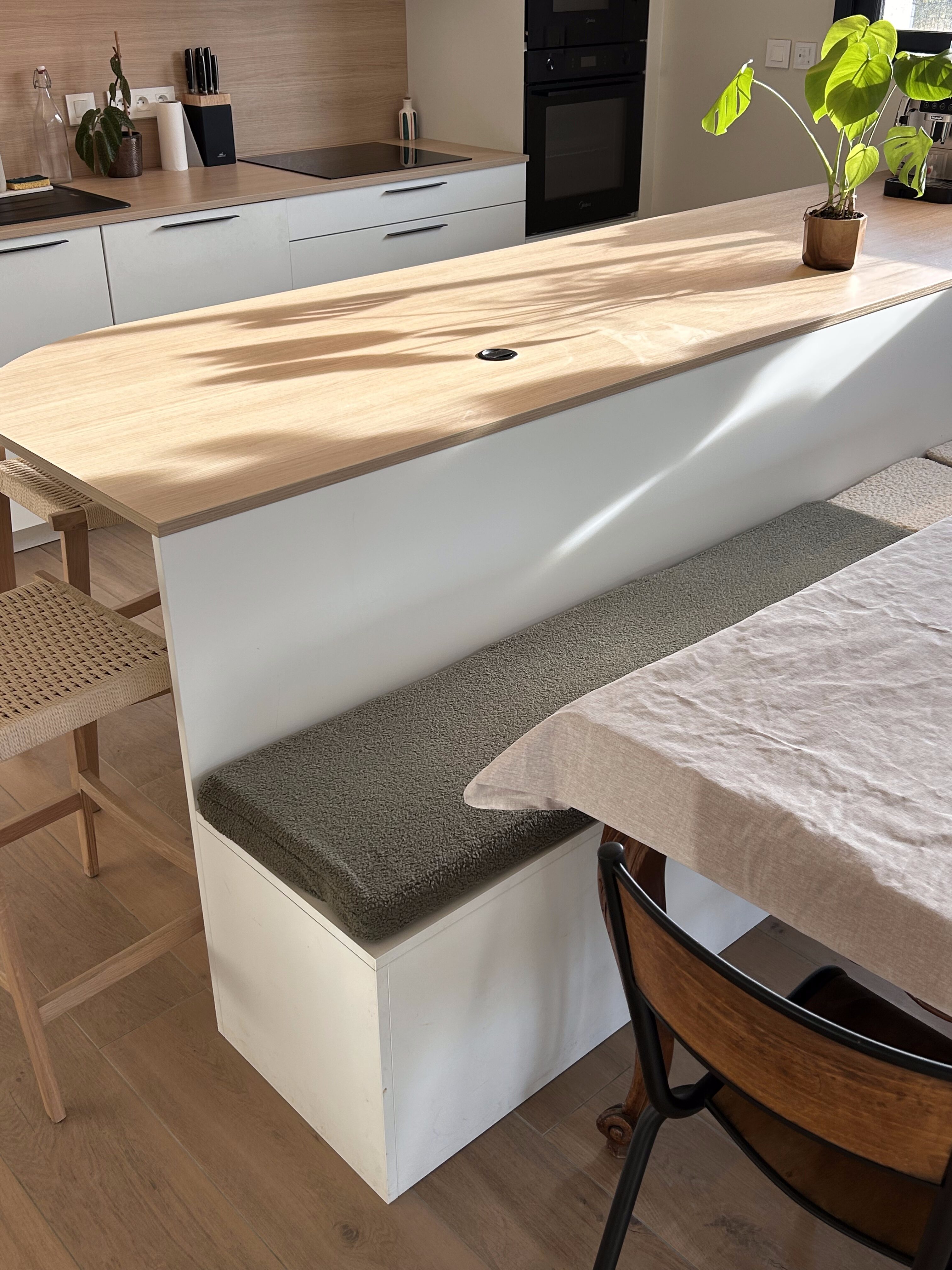 Son secret ? Un plan de travail arrondi pour la fluidité et une banquette intégrée pour le gain de place. 📐